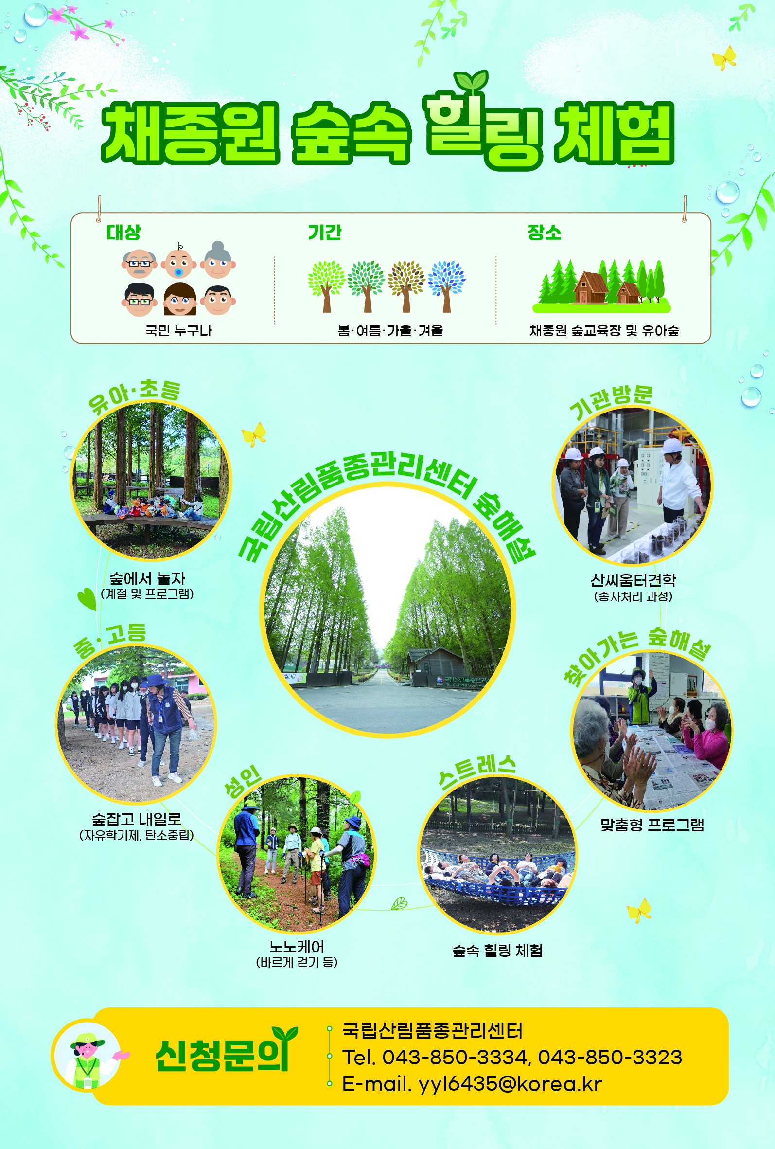 국립산림품종관리센터 내 채종원(산림종자 과수원) 숲교육장과 유아숲 2곳에서 운영되며, 유아들을 위한 채종원 숲속 놀이터, 청소년 자유학기제 교과과정 숲잡고 내일로, 노년층 및 소외계층 전용 숲 나들이, 소방·경찰 등 직장인 외상 후 스트레스 완화 맞춤형 체험 프로그램으로 운영한다.