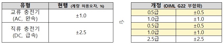 기존 교류(완속), 직류(급속)로 단일화 돼있던 등급이 교류는 0.5급, 1.0급, 직류는 0.5급, 1.0급, 2.5급으로 세분화된다.